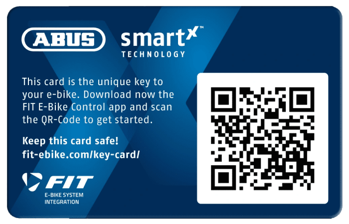 独特的 FIT 钥匙卡是进⼊任何搭载 Pinion 系统电动⾃⾏车数字世界的⼊场卡。其独有 ID 使 ⽤ ABUS SmartX 技术,并通过独特的钥匙与⾃⾏车建⽴安全连接。使⽤电动⾃⾏车控制应 ⽤扫描⼆维码还能解锁实⽤的附加功能。