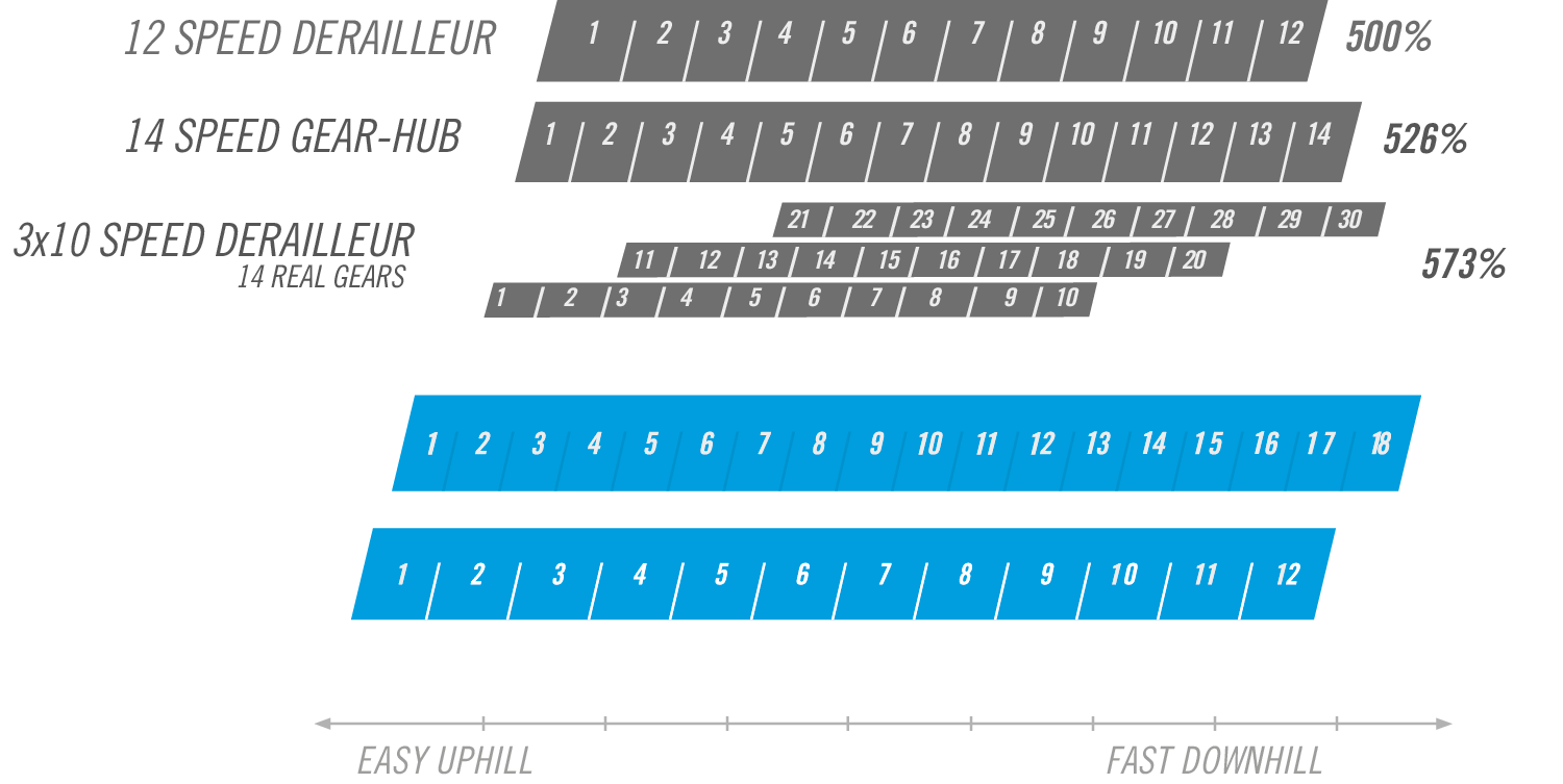 齿轮配置针对旅行用途进行了优化,从徒步到山地车。P1.12变速箱拥有600%的档位范围,性能远超同类变速器。